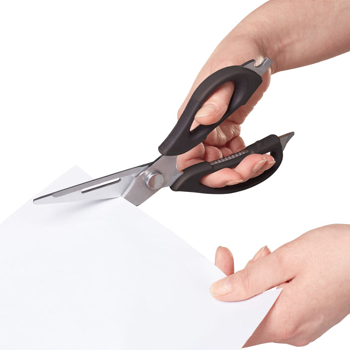 Doordat de bladen van de Multifunctionele schaar los te maken zijn, kan je ze gebruiken als schaar maar ook als mes. Door de sterke en scherpe bladen kan je makkelijk papier en zelfs plastic knippen. De ene blad is aan de buitenkant gekarteld. Hiermee kan je brood snijden.