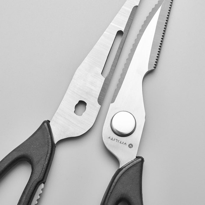 Als je in de keuken bezig bent, dan heb je regelmatig verschillende hulpmiddelen. Zo heb je messen nodig om vlees of groenten te snijden. Maar je kan ook een dunschiller nodig hebben om aardappelen of fruit te schillen. In plaats van verschillende hulpmiddelen te kopen, kan je ook kiezen voor de Multifunctionele schaar van VITILITY. Doordat de schaar scherpe en stevige bladen heeft kan je zowel papier als plastic knippen. Tevens is het mogelijk om vlees te knippen, zoals kip bijvoorbeeld of ribbetjes. Maar je kan de bladen losmaken van elkaar en kan je ze gebruiken als messen. Eén van de bladen is zelfs een dunschiller. Aan de ene kant van het handvat zit een flesopener en aan het andere handvat zit een schroevendraaier. In het midden van de handvaten zitten twee geribbelde metalen delen. Hiermee kan je zelfs walnoten kraken. Tevens wordt de schaar geleverd met een houder, waardoor je de schaar makkelijk op kan bergen. Zoals je kunt zien is de Multifunctionele schaar het ideale hulpmiddel voor in de keuken. Het heeft alles wat je regelmatig nodig hebt, in één product. VITILITY heeft een breed assortiment van handige producten. Kijk in onze webshop voor ons uitgebreide assortiment