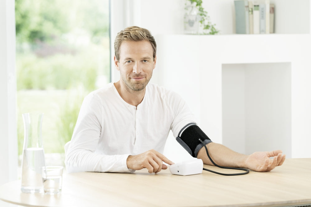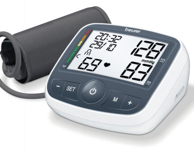 Vol automatische bovenarm bloeddrukmeter met groot eenvoudig leesbaar LCD-display. 2 x 60 geheugens. Waarschuwing bij eventuele hartritmestoornissen. Manchet omtrek 22-35 cm.